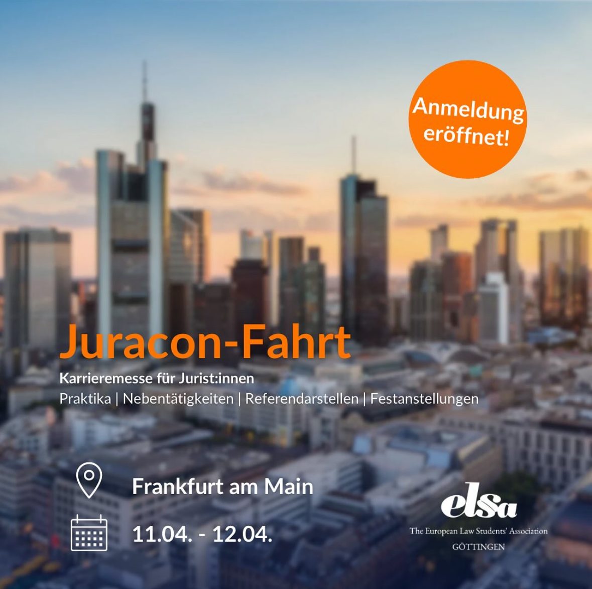 Bei der JURAcon handelt es sich um eine deutschlandweite Karrieremesse für Jurist:innen und bietet ein breites Programm von Workshops zu diversen Themen, Legal Tech sowie NGO’s hinzu zur Prüfungsvorbereitung, sodass für Jurastudierende aus allen Semestern passende Themen angeboten werden. Gemeinsam fahren wir am 11.04.2024 nach Frankfurt, wo dann für euch ein Rahmenprogramm eingeplant ist. Damit auch der ELSA Spirit nicht zu kurz kommt, feiern wir abends in einem exklusiv für ELSA angemieteten Club. Für alle ELSA Mitglieder kostet der Eintritt 10€ vor Ort!
