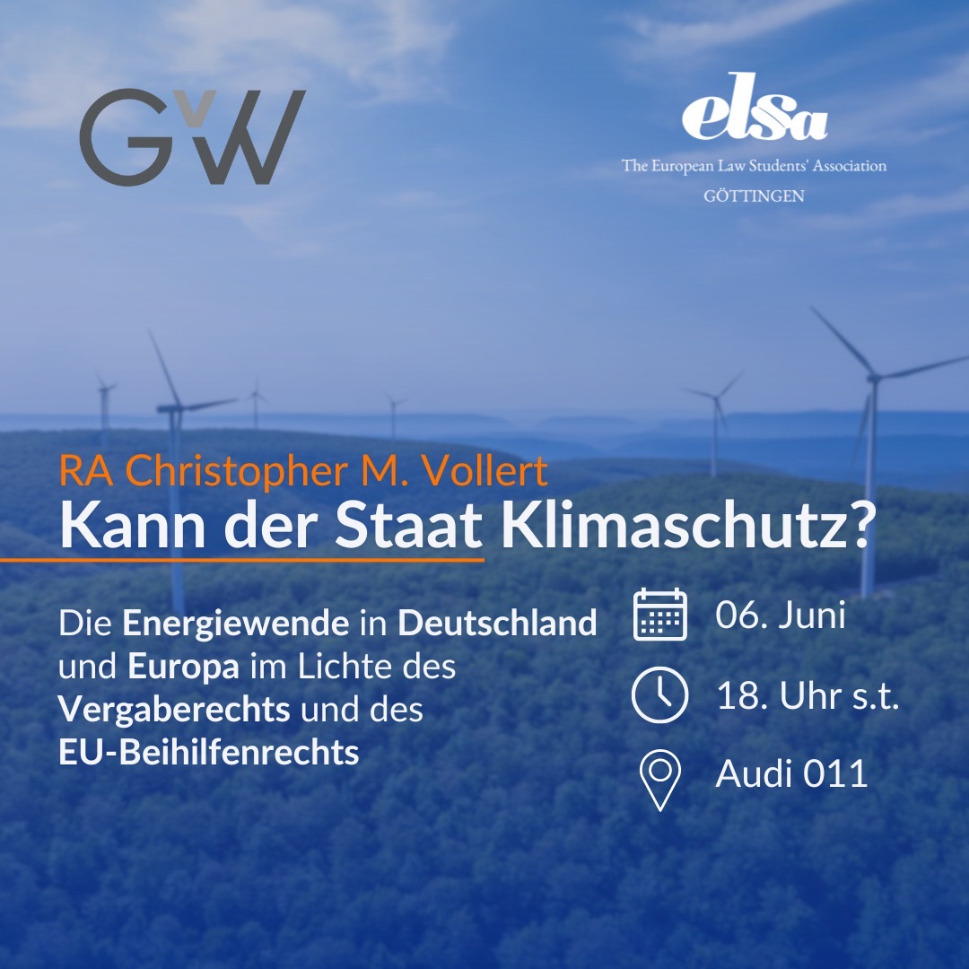 Europa steht mit der Klimakrise eine bisher kaum dagewesene Herausforderung bevor. Die dazu notwendige Energiewende bringt ebenso Chancen wie Probleme mit sich. Daher freuen wir uns, zusammen mit Graf von Westphalen einen Vortrag zu diesem Thema organisieren zu dürfen. Rechtsanwalt Christopher M Vollert aus Hamburg wird die Energiewende in Bezug auf das Vergabe- sowie EU-Beihilfenrecht vorstellen und uns dadurch einen spannenden Einblick auf die Rolle des Staates im Klimaschutz geben.